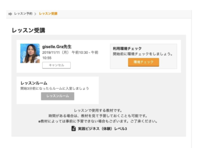 レッスンの予約が完了すると、レッスン受講というページが出てきます。
