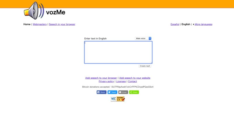 vozMeは入力したテキストを音声で読み上げてくれ、それをMP3形式にしてくれるサイト。