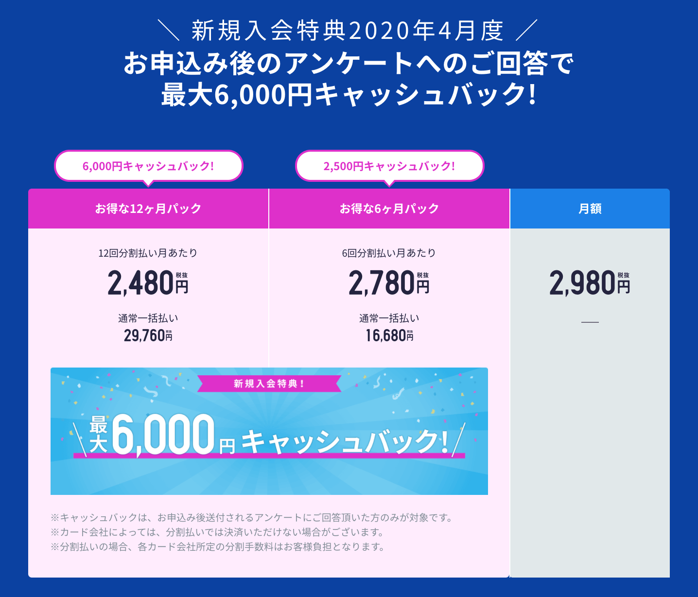 4月度に入会をすると最大6,000円のキャッシュバックキャンペーンをやっているのでさらにお得。