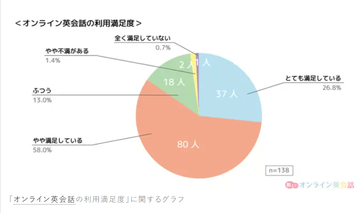 アンケートの結果、約85%の人がオンライン英会話を総括的に評価した時に満足したと答えています。