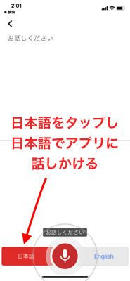 - 「日本語」をタップし日本語でアプリに話しかける。