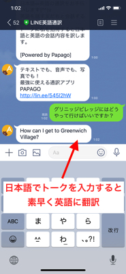 LINE英語通訳は日本語でトークを入力すると英語に翻訳してくれます。日本を打ってすぐに英訳されるので、翻訳スピードの速さと精度に驚かされます。