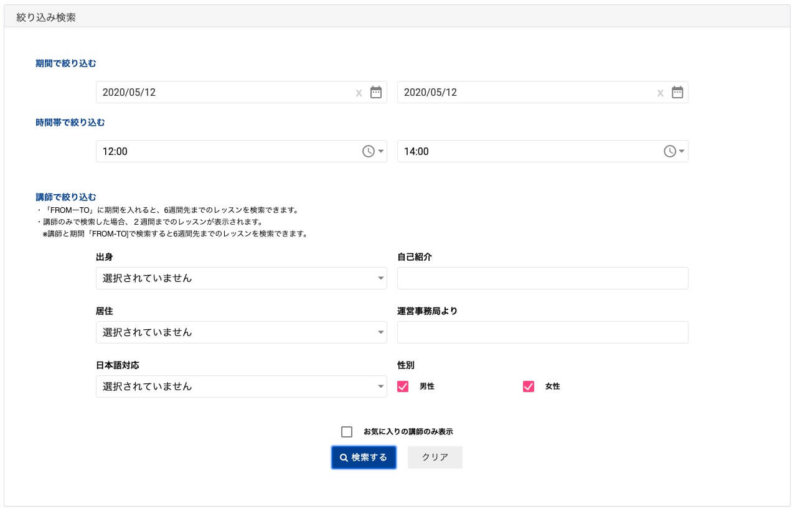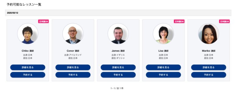 講師は日本人講師や英語ネイティブ出身講師だけが表示されました。