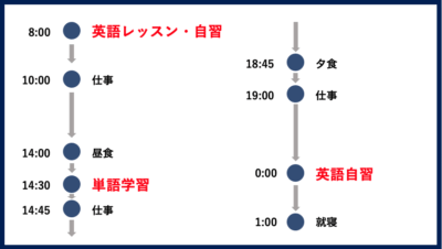 予定:自習14時間(1日2時間)、レッスン2時間(英語レッスン25分×3+バイリンガル50分)