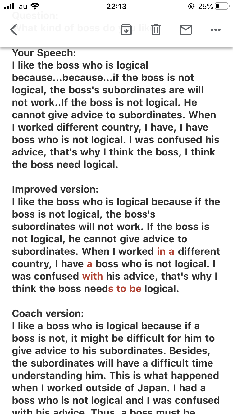 ちなみに、英語レッスンの後2時間くらいで、自分が話した内容、それを修正してくれたもの、講師オリジナルの回答が音源付きで送られてくるのでかなり復習しやすい。ALUGOぐう有能。