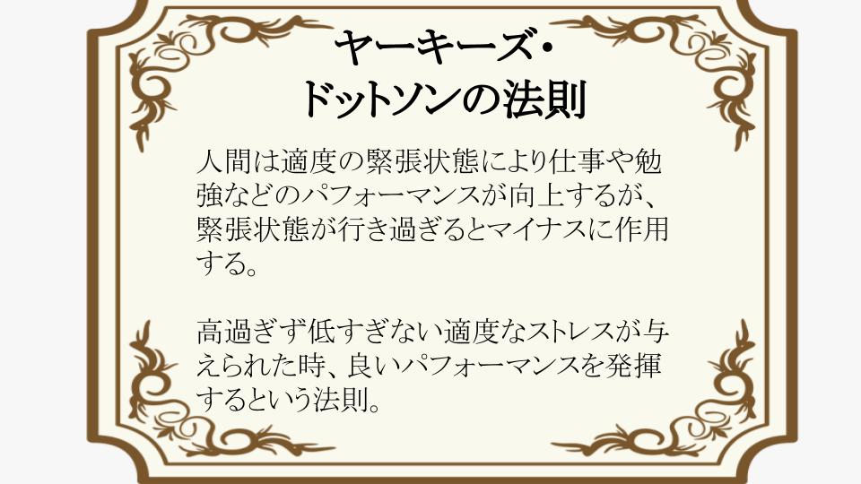 簡単にいうと、「適度なストレスがあった方が集中力が上がる」という法則だ