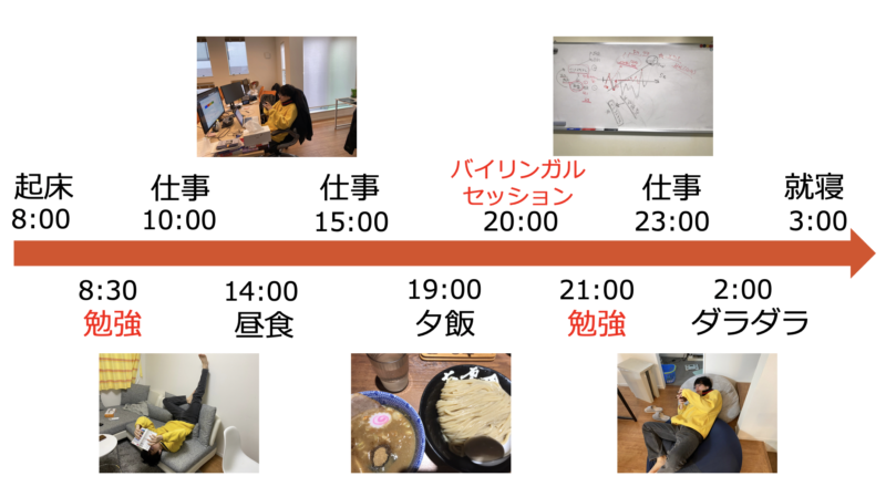 予定:自習 18時間(平日2時間、休日4時間)+レッスン(週3回の英語レッスン+週1回のバイリンガルセッション)