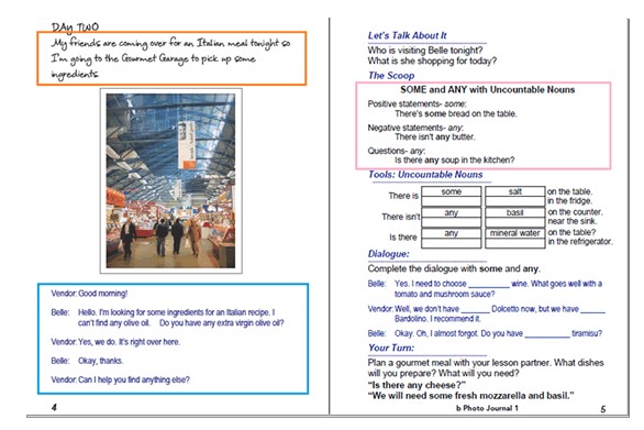 画像右のピンクの枠の部分にはそのページで学習する文法がまとめられていて、オレンジの部分はBelleのダイアリー、青い部分はBelleと誰かの会話になっています。