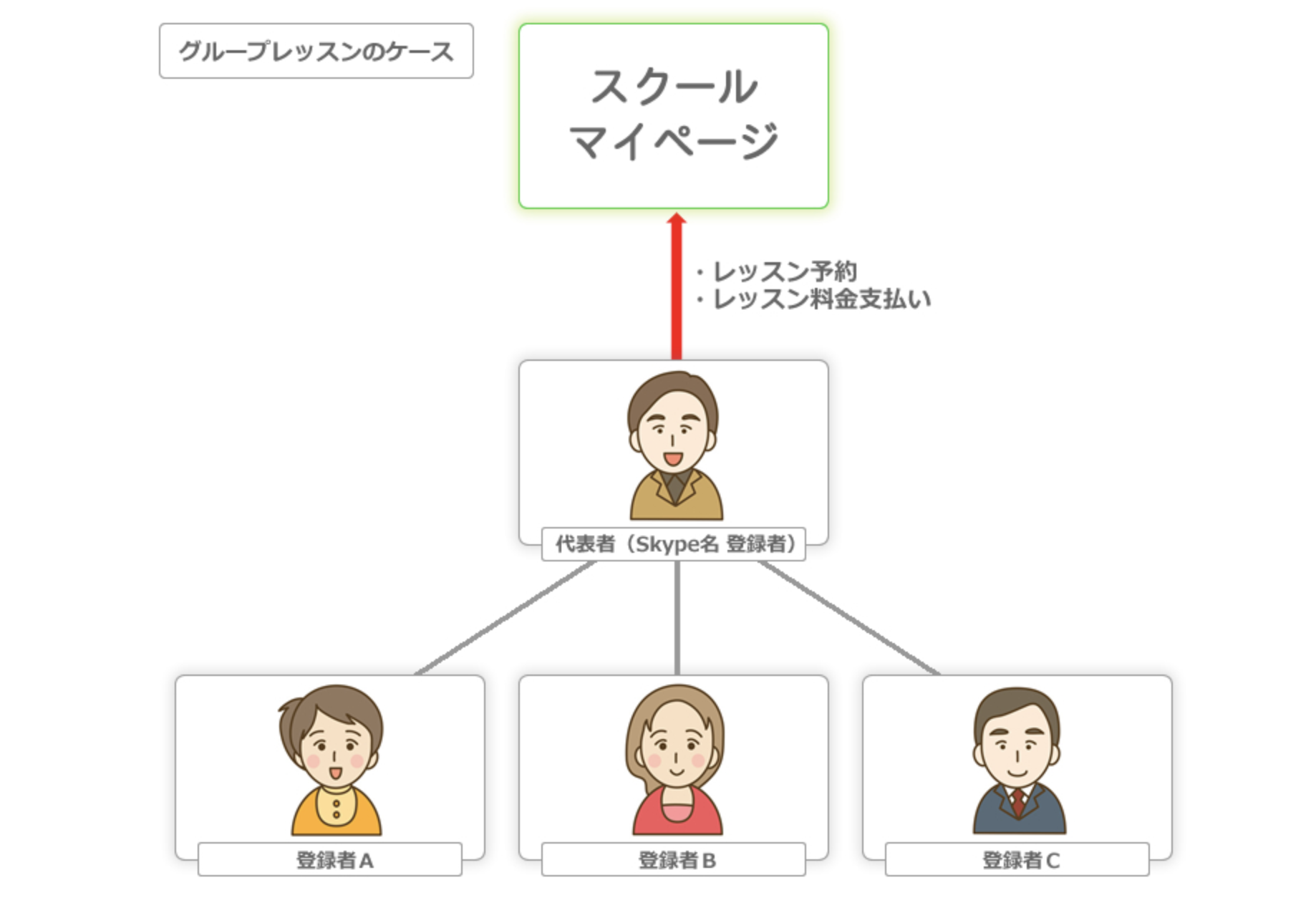 グループレッスンでは、代表者の方がSkype名を登録し、レッスン予約、レッスンのためのポイント購入をまとめて行えるシステムとなっています。