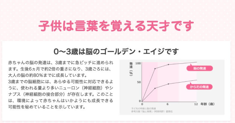 しかし、実は英語学習は0~3歳という最も頭の柔軟性が高いタイミング(ゴールデン・エイジ)で行うのが最善とされています。