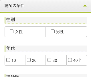 検索条件は割と細かく、定番の性別・年齢はもちろん、レッスン内容などでも指定ができます。