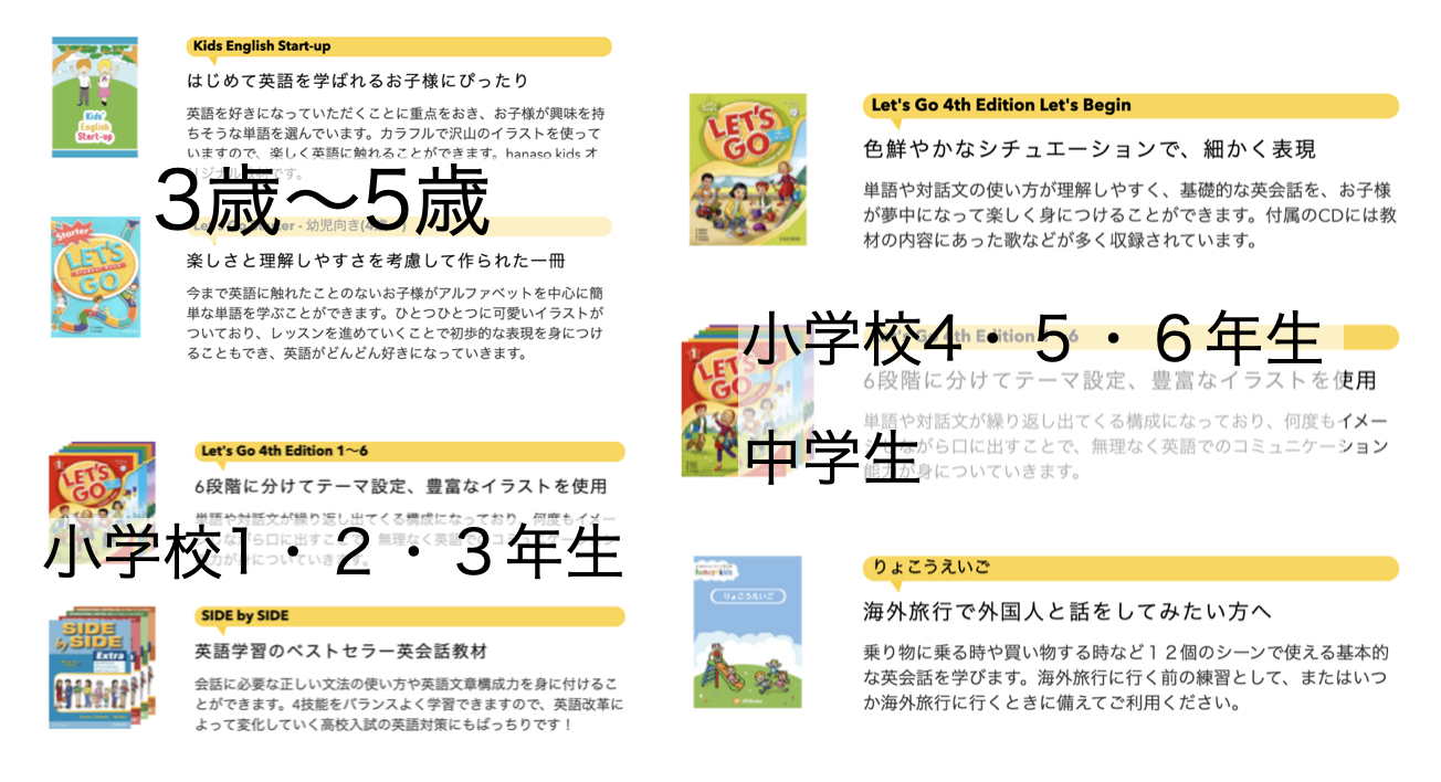 「Let's go」の教材が終わったお子様や、小学校高学年や中学生のお子さんにおすすめです。