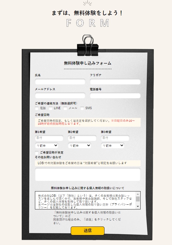 登録フォームには「お名前」「メールアドレス」「電話番号」「希望日」のみ入力すればお申し込みは完了です。