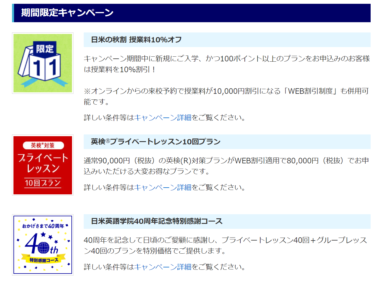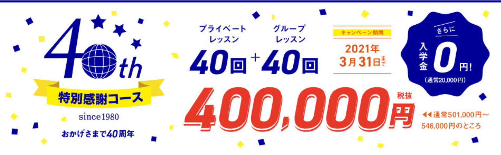 2020年9月現在だと、秋の授業料10%OFFキャンペーンや40周年記念の特別プランなどが提供されていました。