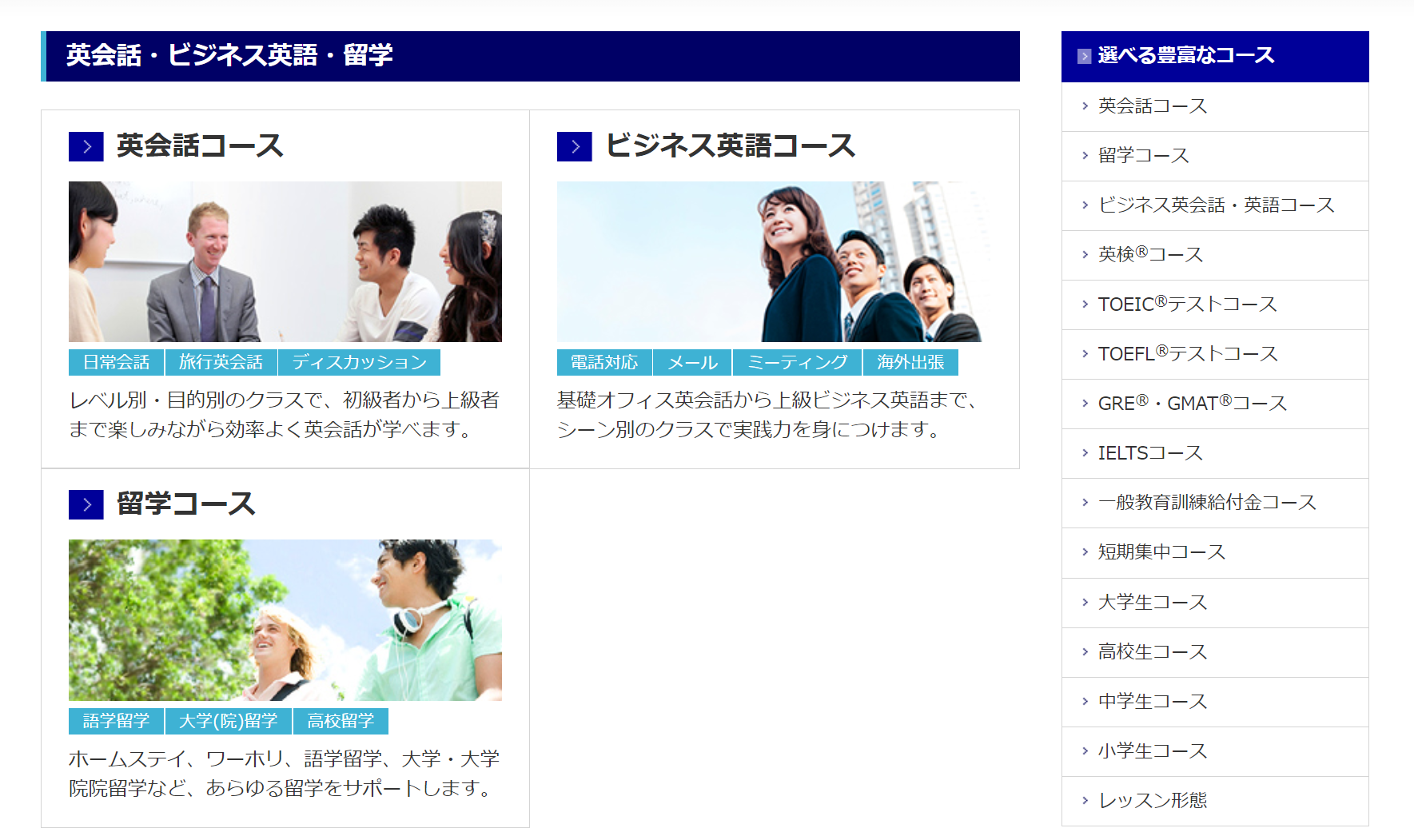 学生向けのコースから資格対策コース、ビジネスに特化したコースなど様々なコースがあり、子供からビジネスマンまで幅広い年代の英語学習に対応しているのが特徴。