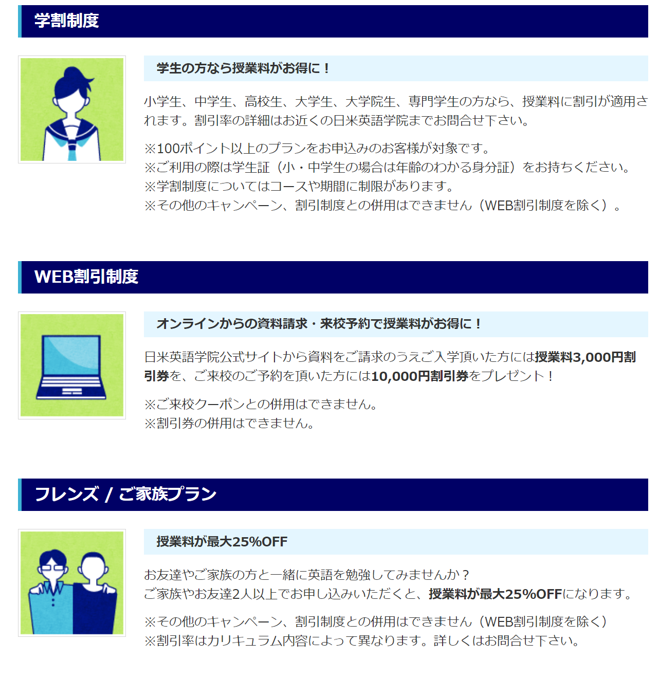 日米英語学院には期間限定のキャンペーンと、通年の割引があります。