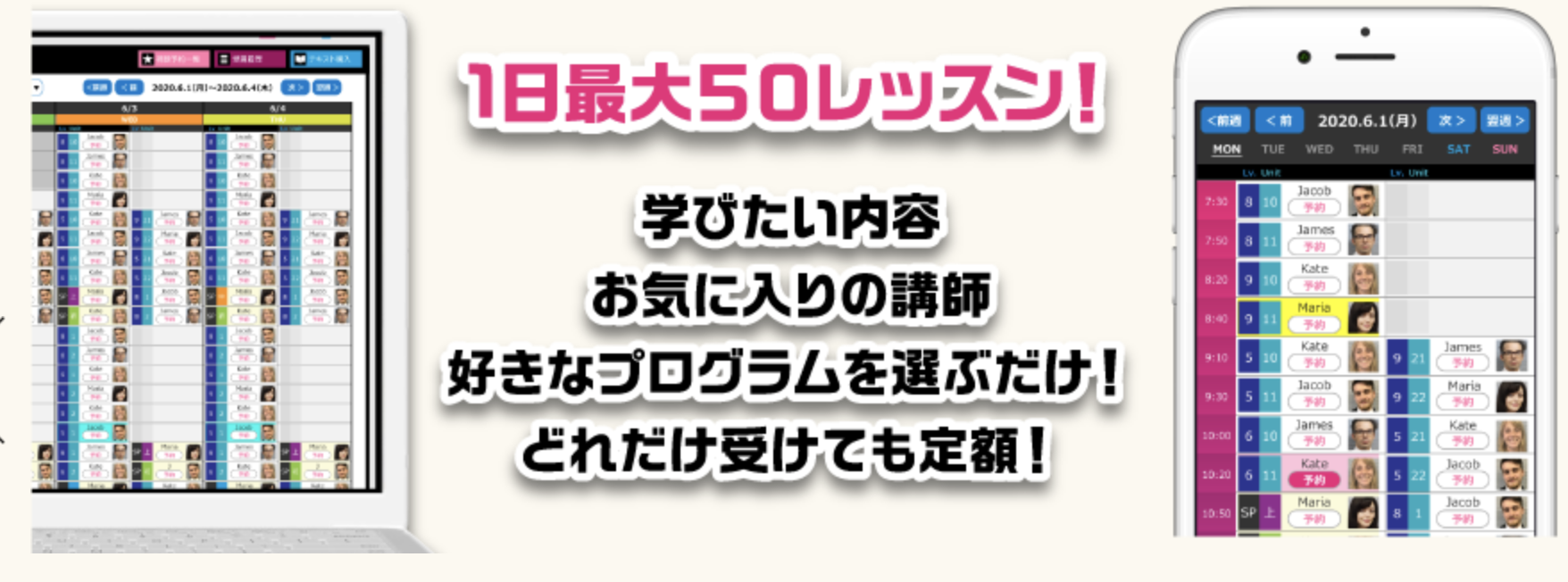 1日に最大50のレッスンがLIVE配信されるので、対面レッスンの予約や復習、機にいっている講師のプログラムをチェックしてみたり、自由に参加が可能です。
