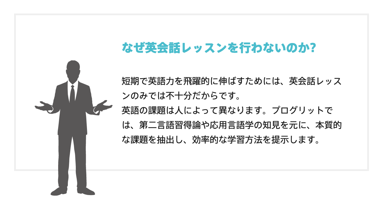 もともとが急遽英会話を習得する必要に迫られたビジネスパーソン向けに作られていることもあり、短期間での目に見える成果に強みを持っているのがプログリットです。