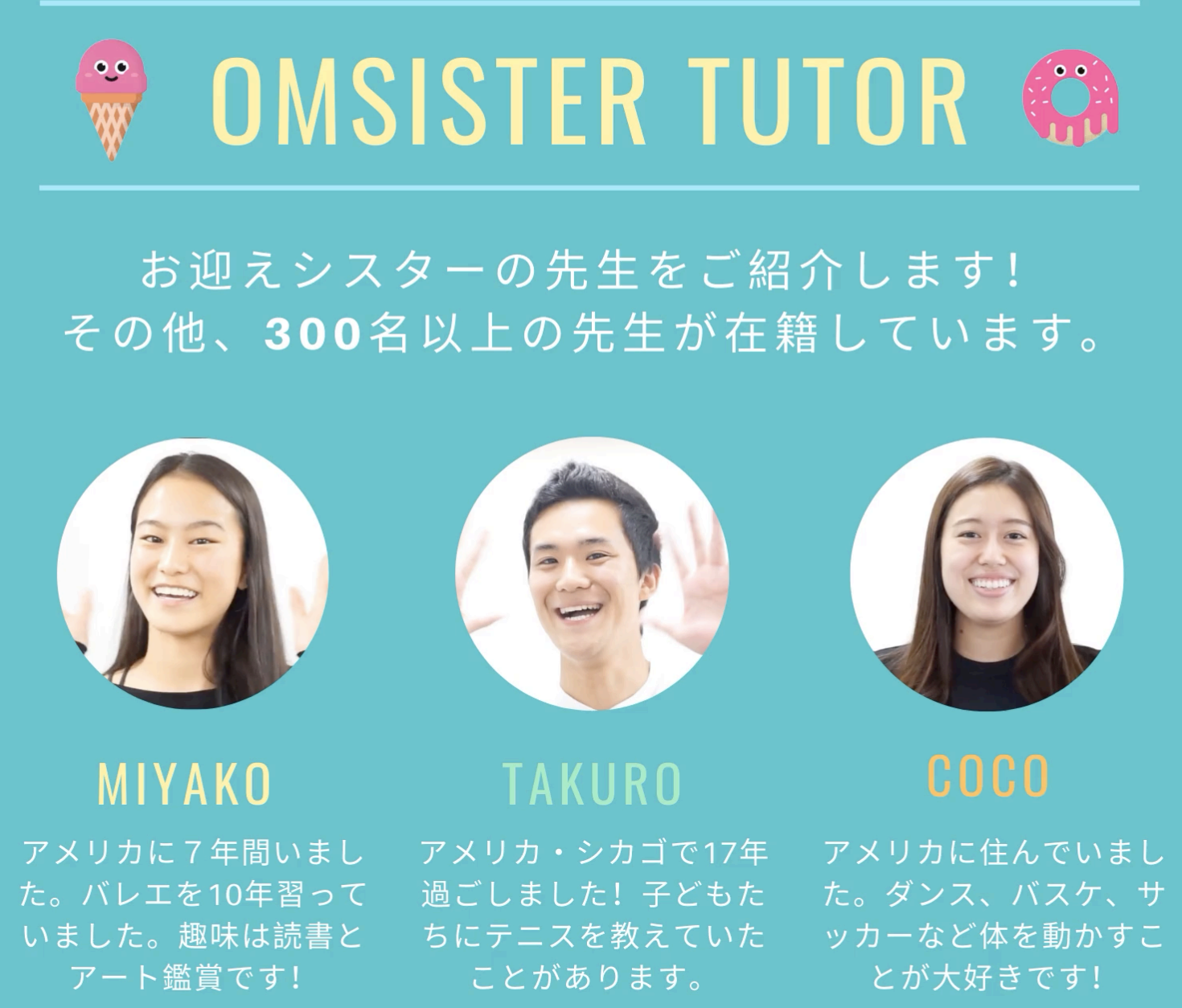 お迎えシスターでは、個別レッスンのため、こどもに合わせて実施ができて、先生がこどもと年齢が近くて、英語ができるだけではなく色んな国での経験や文化を知っている先生が来てくれるというところが、良いなと感じました。