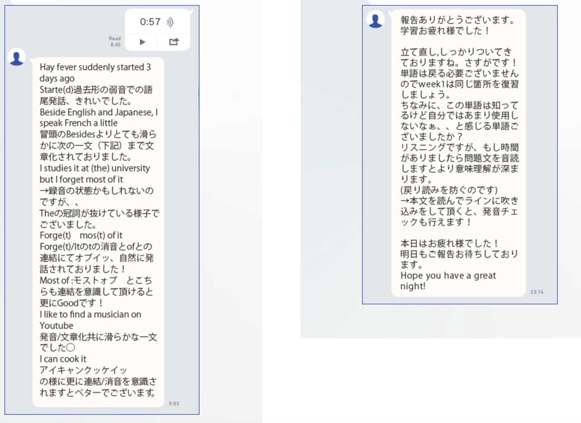 さらに、普段のトレーニングなどでは発音課題をコーチに送り、具体的なフィードバックが得られます。