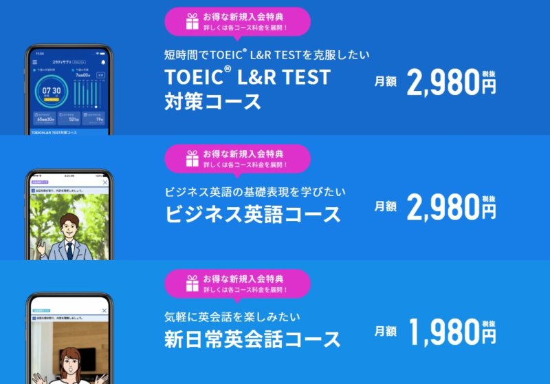 | 月額料金 | 1,980円(日常英会話),2,980円(TOEIC,ビジネス) |