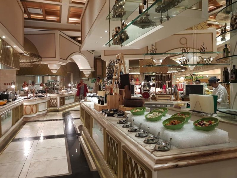 料理はビュッフェ形式がメインで、食事中にダンスショーなどを見ることができるが魅力。