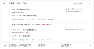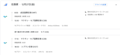 セブ経由はマニラほど安くはないものの、セブからドゥマゲティまで地理的な距離が近いのがメリット。