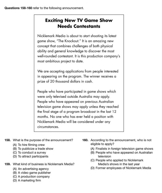 試験問題は設問含め全て英語であり、「英語圏に住む人が日常生活やビジネスの場で目にするような文書」が様々な形で出題されます。